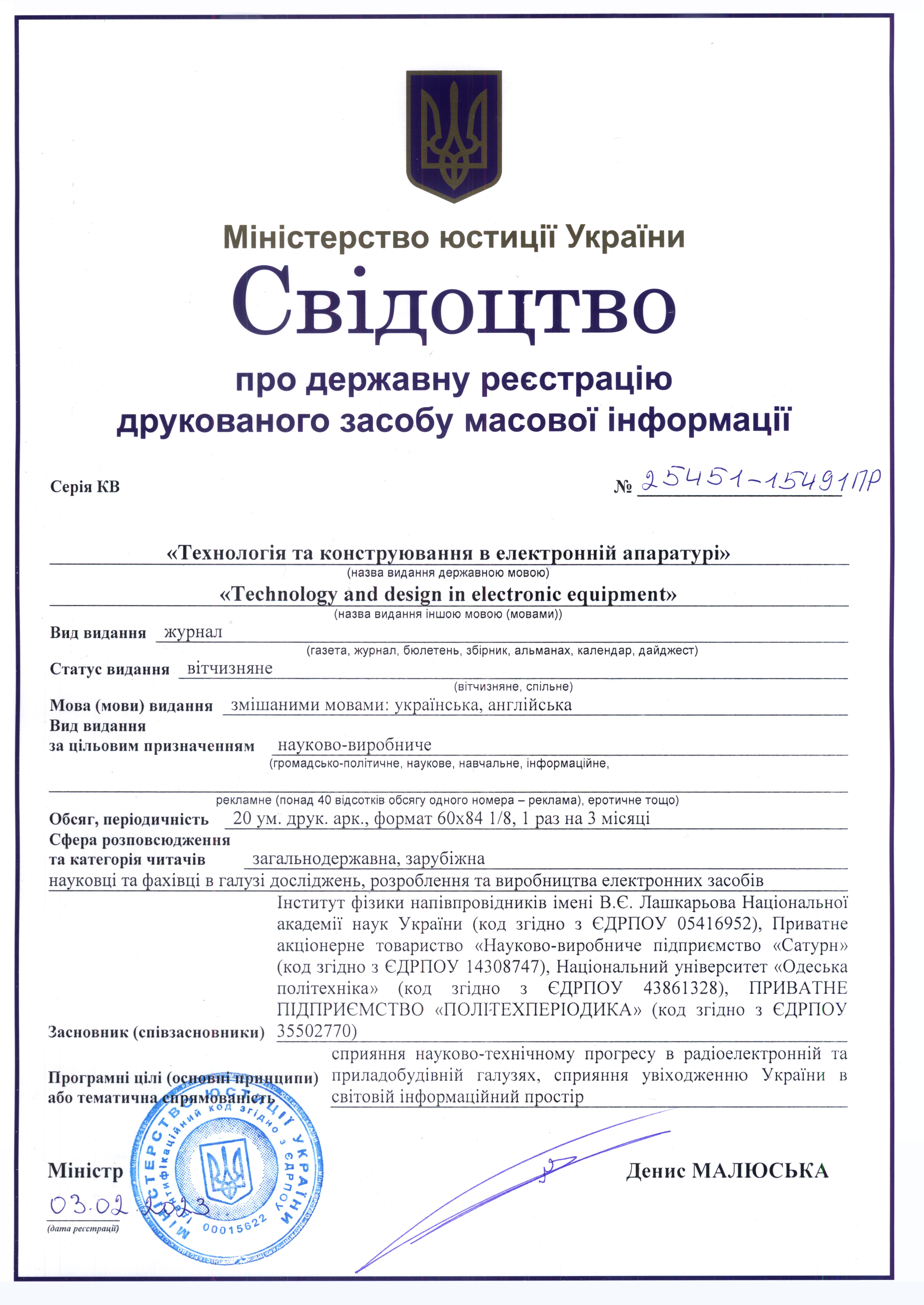 Включено до категорії «Б» Переліку наукових фахових видань України у галузях «Технічні науки» та «Фізико-математичні науки» за спеціальностями:
